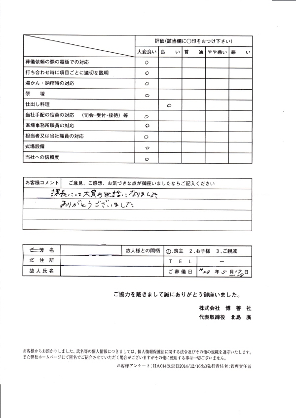 2016年4月 「西区博善斎場」にて一般葬のお客様